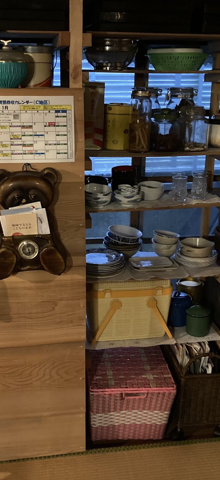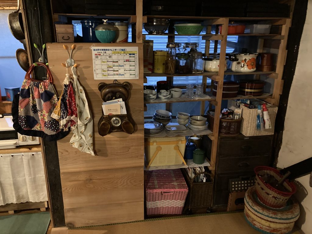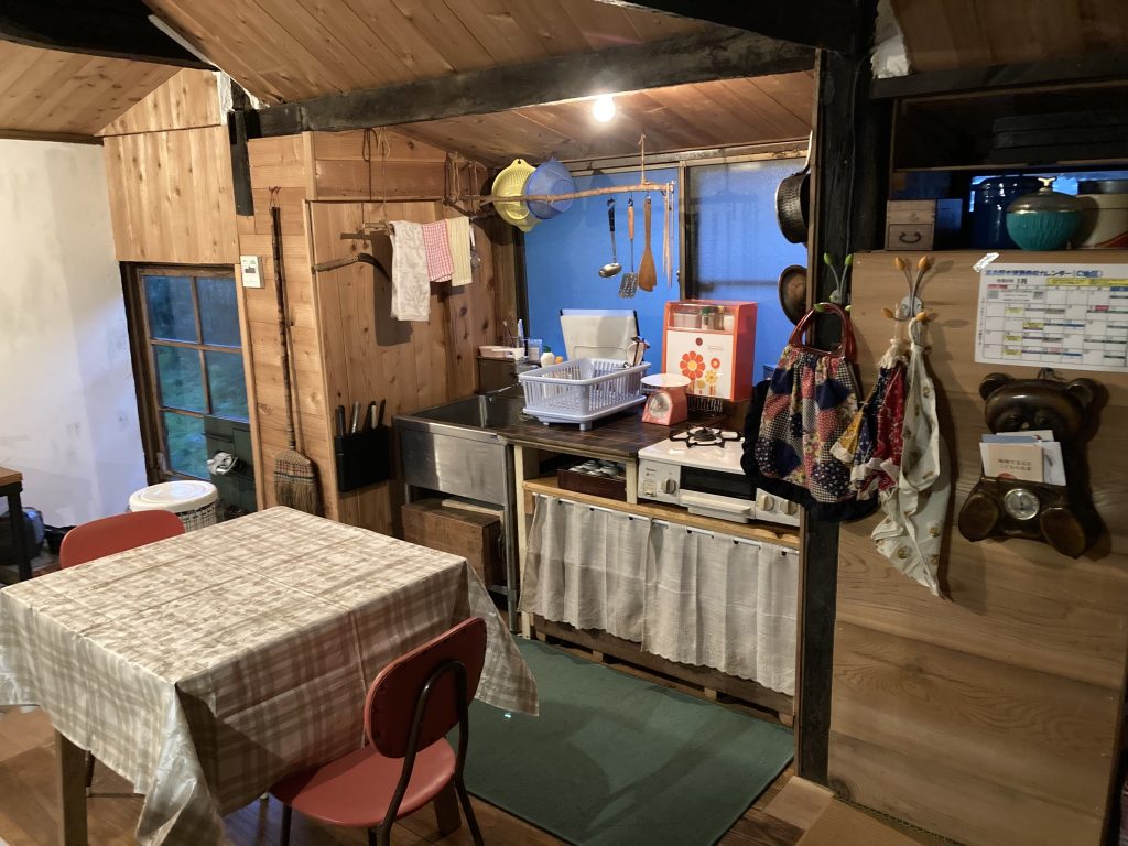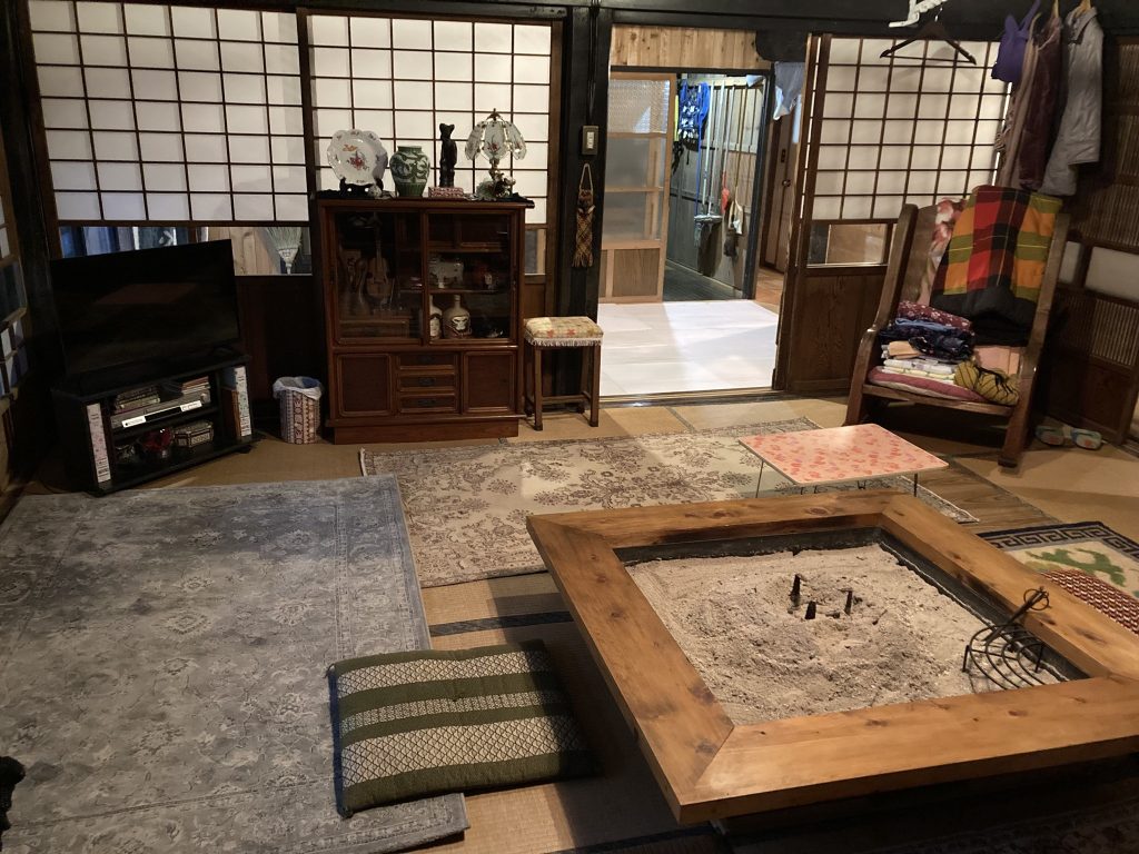 初日は設営で、囲炉裏は実は移動可能(仲間たちとDIY時、床下の根太の間が狭まくて埋め込めなかった)で薪ストーブの和室に移設。たくさんの家具や生活道具が運び込まれる。普段は Simple & Minimam な空間が驚愕するほどモノだらけ(とはいえ普通のお宅ってこんな感じ)のセットに激変。